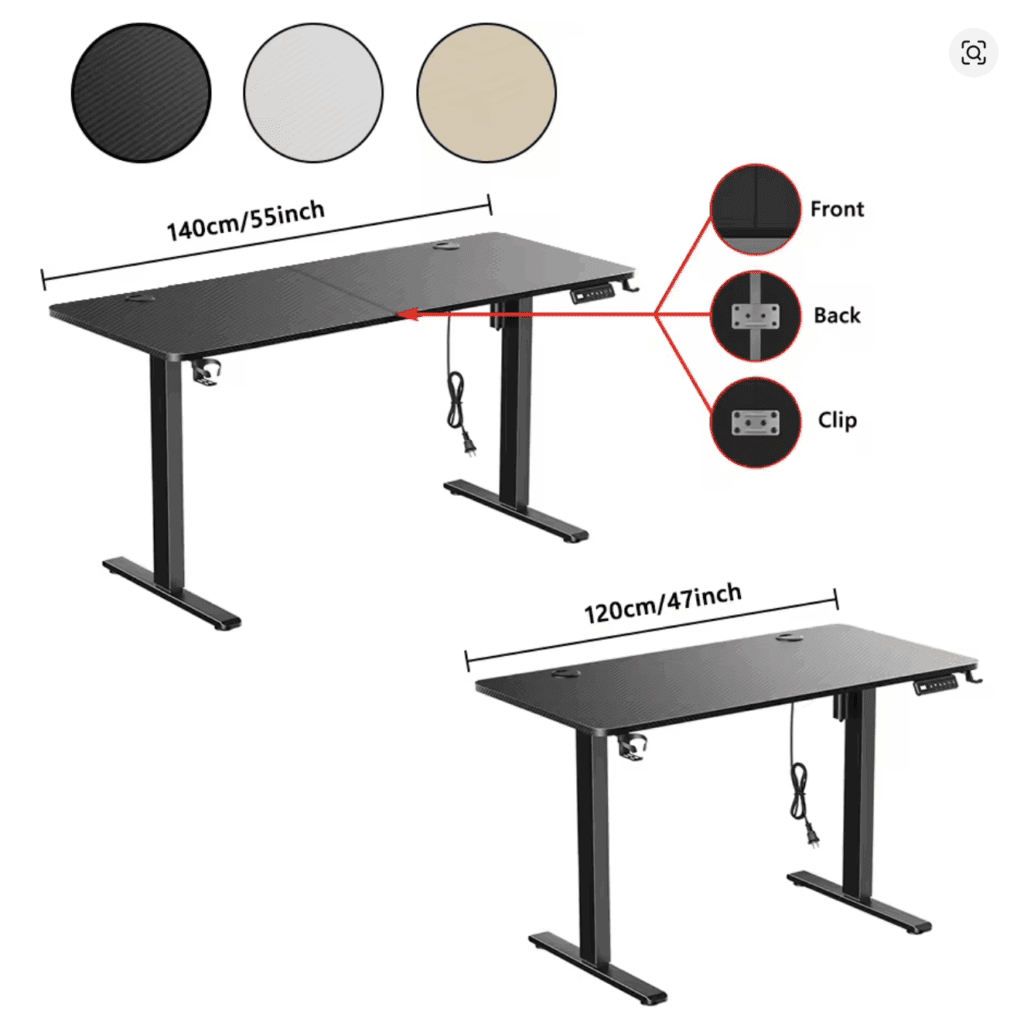 - תוספות ופונקציות: רוב השולחנות כוללים שלט דיגיטלי, אפשרות שמירה של זיכרונות גובה (למשל, גובה 1 לגובה ישיבה, גובה 2 לגובה עמידה), וכן אביזרים נלווים כמו ווים לתליית תיקים, פתחי ניהול כבלים או מגירות מובנות.